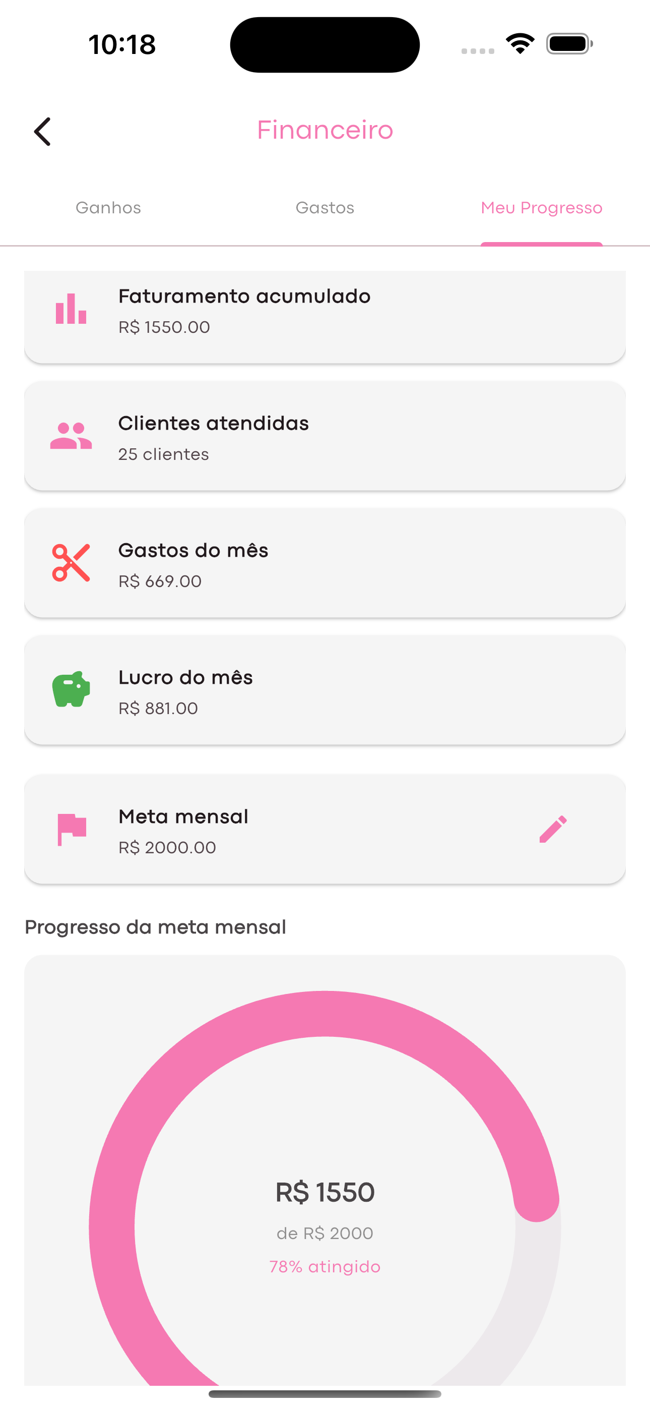 Ganhos, gastos, metas e ticket médio. Visual claro do seu mês.